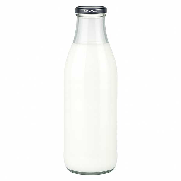1000 ml glasflaske + BioSeal-låg sort UNiTWIST. Absolut lækagesikker med stort TO48-låg. Til mælk, juice og limonade.