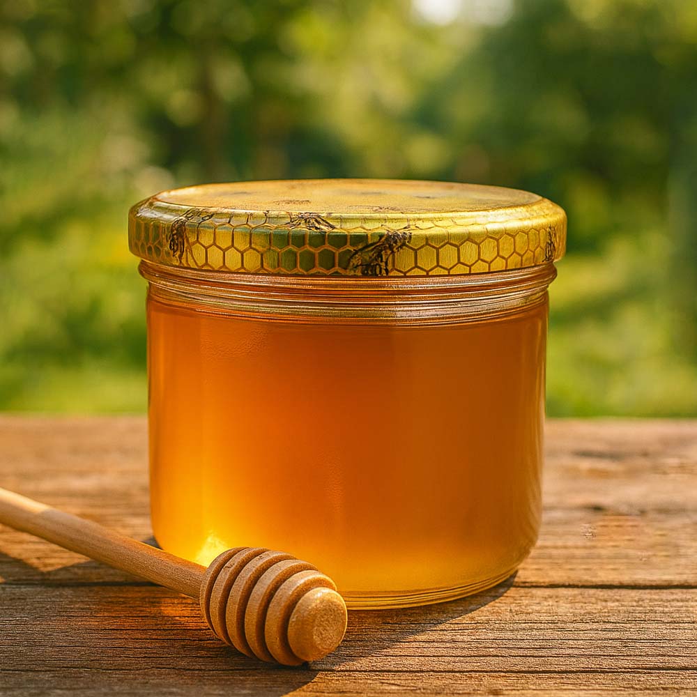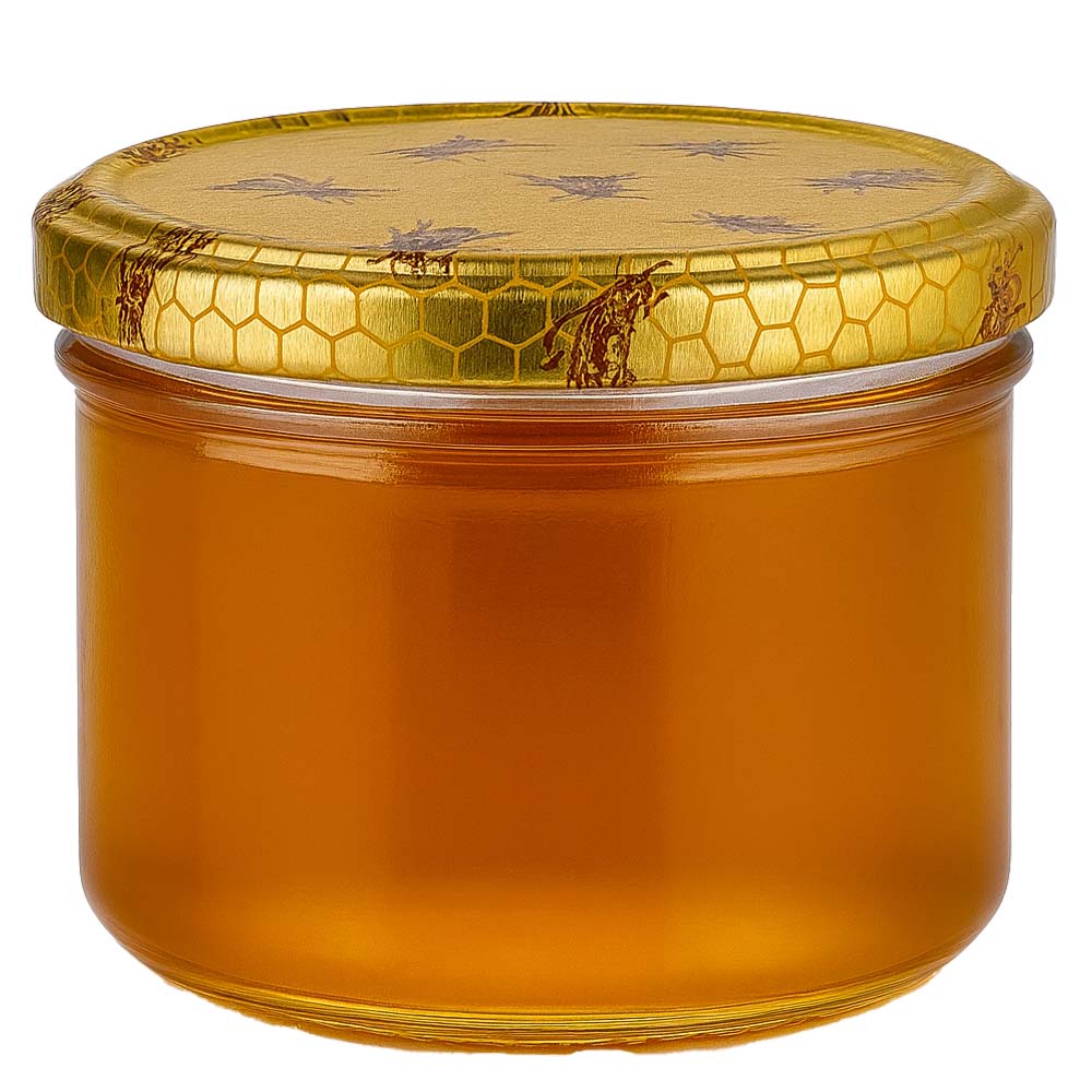 Elegant 300 g honningglas med et metallåg med honningkagemønster BasicSeal UNiTWIST. Det dekorative låg fremhæver honningens naturlige oprindelse og passer perfekt til gaveæsker og gårdbutikker.