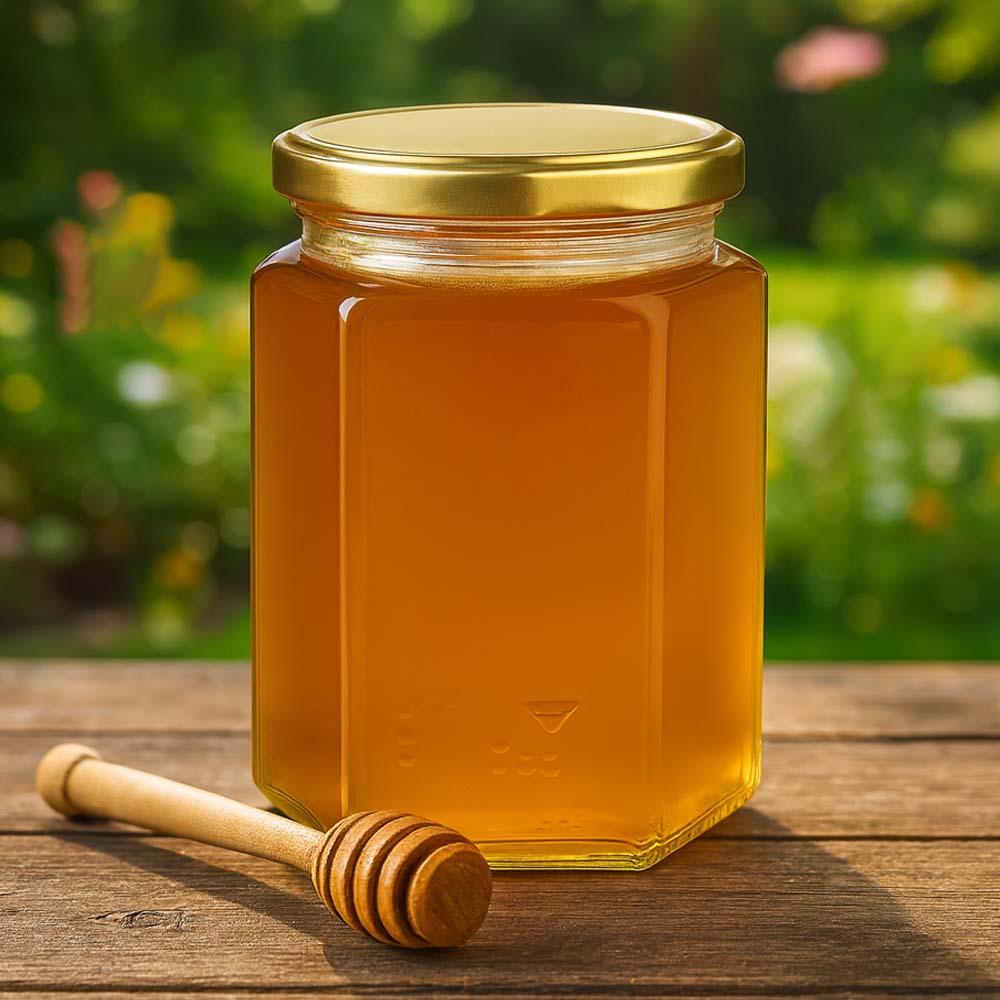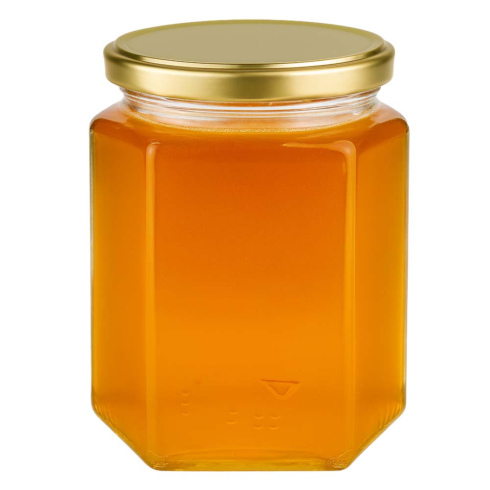 Robust honningglas på 500 g med et elegant gyldent låg BasicSeal UNiTWIST. Ideelt til store portioner, gavepakker og gårdbutikker.