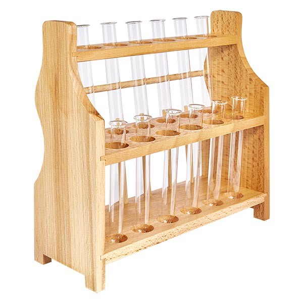 - Beskrivelse: Reagensglasholder af træ med 12 reagensglas af borosilikat 100x12